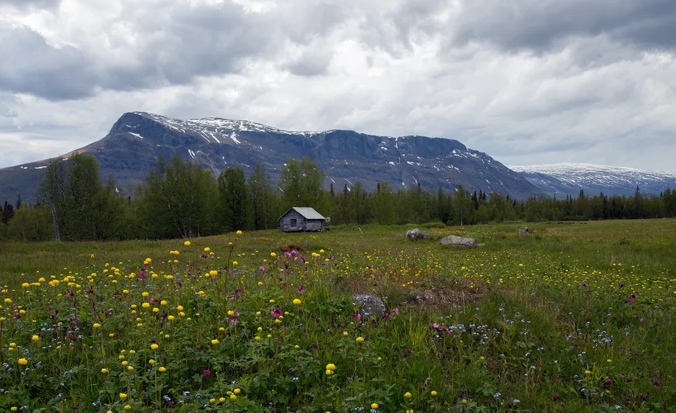 Aktse med Tjahkelij i bakgrunden. Inget vidare väder i mitten av juni. Brännvidd: 35 mm.