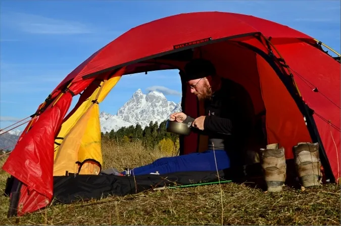 29. Jag äter frukost i tältet strax före Asishi med vy över Mt Ushba 4710 meter.