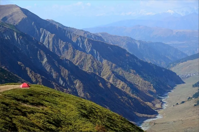35. Mitt tält strax ovanför Chkhunderi Pass drygt 2700 meter. Byn Adishi syns till höger.