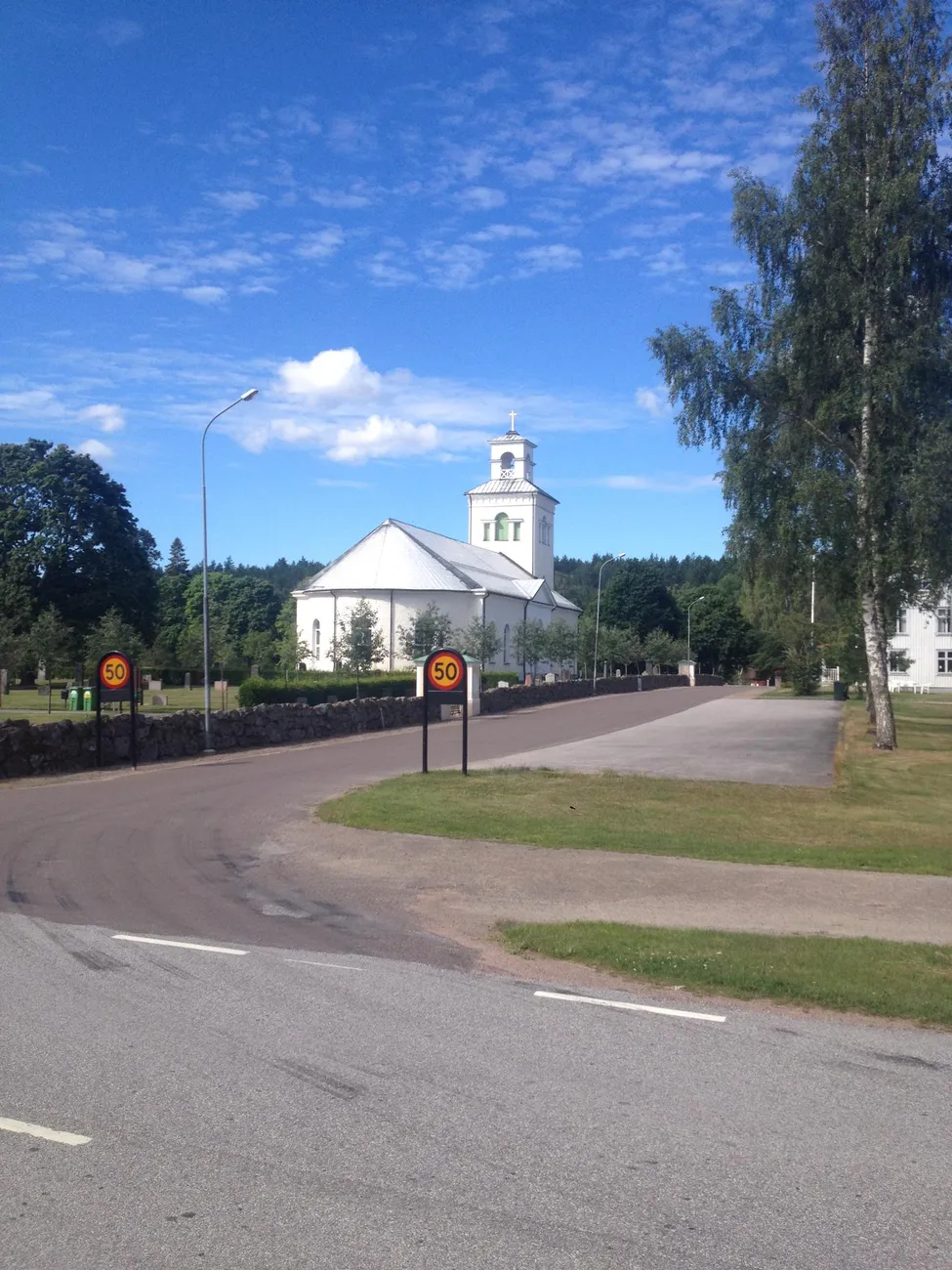 Uppförbackarna mot Norra kvill. Är nu verkligen på väg. Det känns bra! Här syns kyrkan i Rumskulla by. Här finns skola, affär och en trevlig hembyggdsgård. Ligger nära beläget till den välkända Rumskullaeken även benämnd Kvillseken och dessutom "Emils" Katthult där filmerna Emil i lönneberga spelades in.