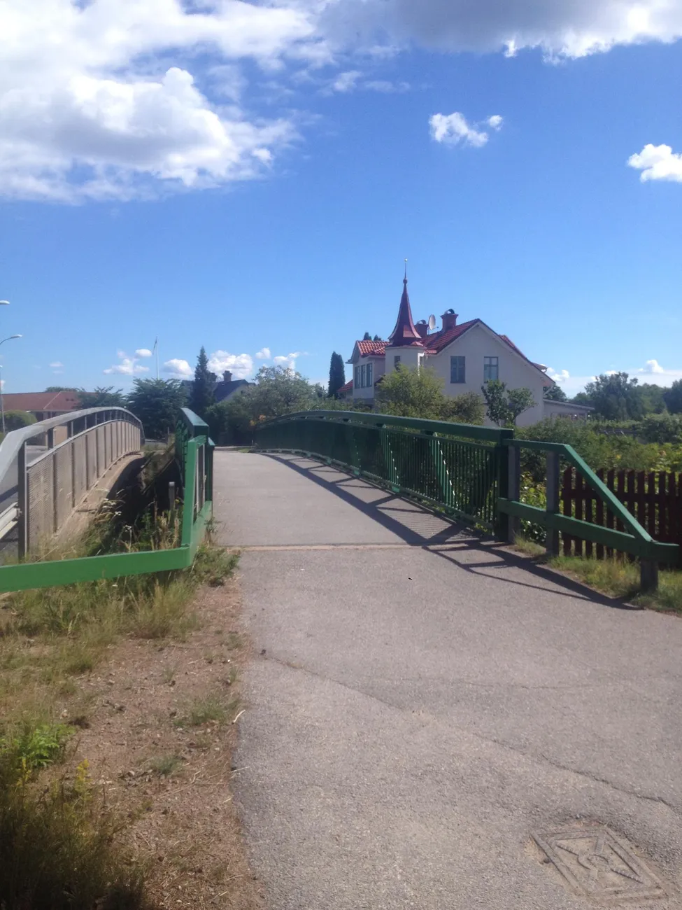 Bro över Järnvägen i Södra vi. Första större samhälle efter ett bra stycke cyklande. Här finns en del affärer, kyrka och hembygdsgård beläget norr om Vimmerby.