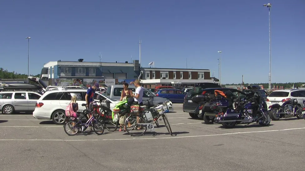 Har nu nått mitt stora delmål på min resa. En härlig känsla att cykla in och ställa sig bland bilar och motorcyklar vid färjeläget. Någon blev nyfiken på min massiva packning på cykeln och undrade om det gick lätt och cykla ändå.