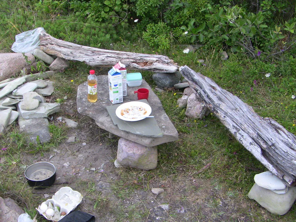 På mitt egenhändigt skapade bord av en stor kalksten och två mindre stenar som bordsben står här frukosten serverad i naturlig miljö.