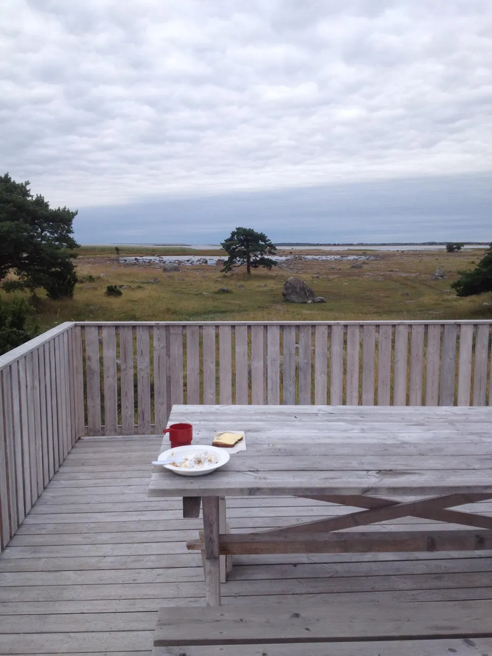 Fint anordnad uteplats för matlagning och servering. Härlig vy mot havet och dess fågelliv! Perfekt plats för fågelskådare och naturcampare! Jag är just ifärd med frukostintaget.