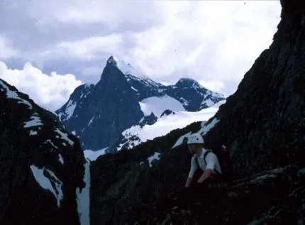 Nicke vid insteget till Søre Dyrghaustind, Hurrungane, Norge. Austabottntind i bakgrunden, en underbar topp!