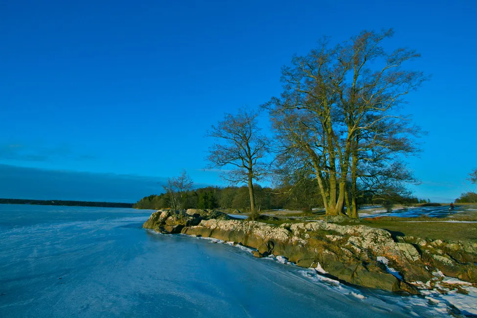 Isen har lagt sig runt en klipphäll i Ekhagen. Just denna klipphäll verkar vara en naturlig destination för många besökare i naturreservatet, och kikar man ordentligt så kan man se att man fordom har använt denna klippformation som en naturlig kajplats.