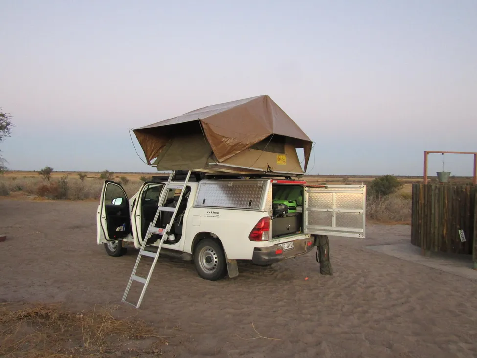 Tält på taket blir en förutsättning för att kunna sova gott med tanke på rovdjuren men även de större däggdjuren som passerar. Himla praktisk och smidig lösning då mörkret faller snabbt i Kalahari.