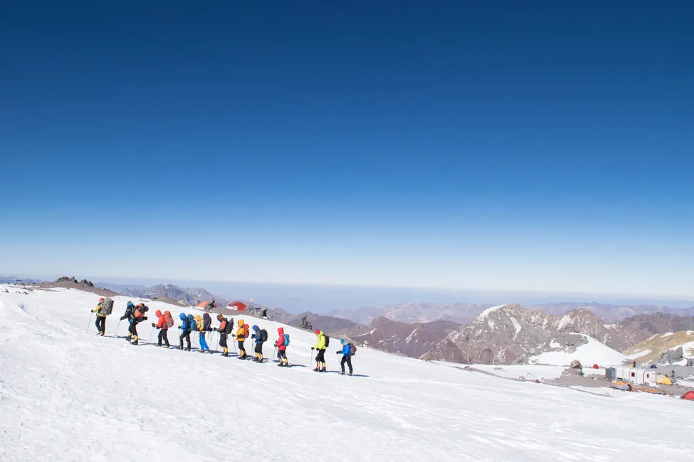 Ryskt färgglatt team på väg upp mot läger 3, Camp Berlin/Colera, 6000m.