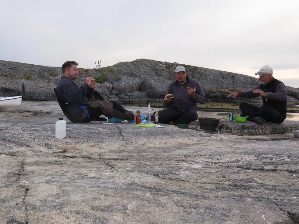 Intagande av middag på den släta och varma berghällen.