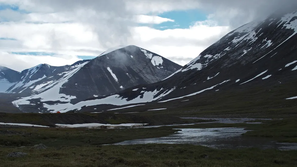 Ballinvagge. Ballinriehppi längst t.v. Ballinbogicohkka i mitten och Tjåmahus t.h.
