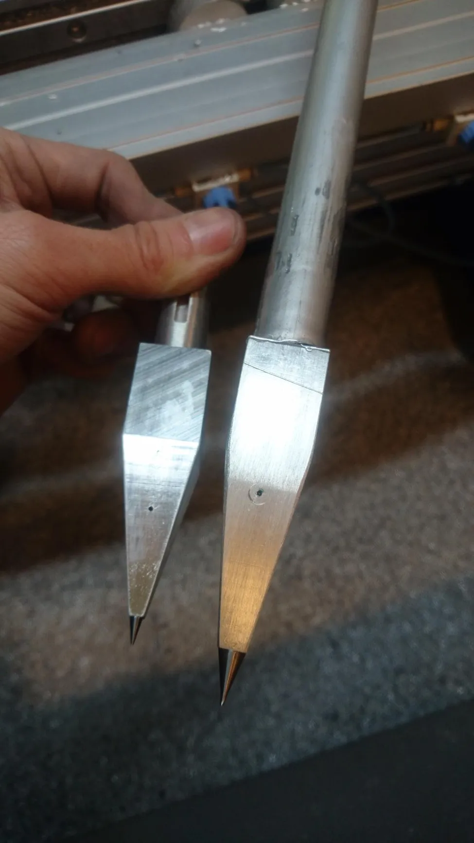 I den som jag håller i handen kan man skönja ett avlångt hål som jag delvis täcker med min tumme då jag håller den. Det hålet gjorde jag för att jag tänkte att det skulle bli bättre fäste för epoxylimmet om jag "laddade" i det där och sedan sköt in spetsen i skaftet och snurrade på den så limmet som låg i hålet skullle bredas ut på skaftets insida. Jag vet inte om det blev bättre eller sämre med det hålet, men det sitter där i alla fall.#DIY #epoxylim #gör-det-själv #ispik #pik #pikspets #spets