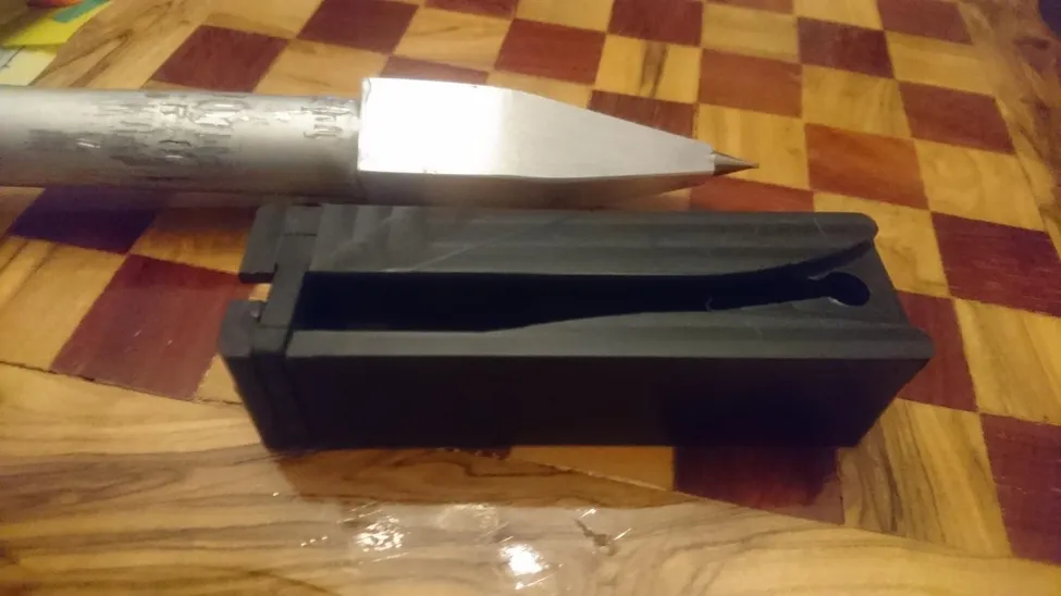 Här ser man skyddet utan att pikspetsen är i. Det runda hålet i fronten på skyddet är till för att det skall tåla att böja sig lite när det sätts på och tas av från pikspetsen. Det finns ett spår runt om hela skyddet som gummisnodden löper i, så den inte skall kunna halka av så lätt. Långsidan är bara delvis öppen. Det är överhäng på en sida av skyddet som hindrar spetsen att bara kunna tas ut ur skyddet från sidan. Det är motsatt överhäng på andra sidan, så de kompletterar varandra.#ispik #pik #säkerhet #transportskydd