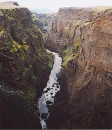 Markarfljótsgljúfur är en färgsprakande 100 m djup kanjon. Missa inte att åla fram till kanten om du knallar Laugavegurinn på Island.