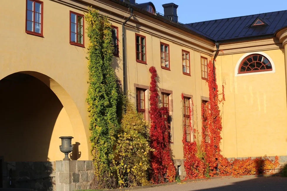 Klätterväxter i Linneanums innergård som blivit färggranna av hösten.