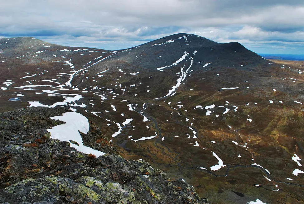 På bilden ses utsikt från toppen mot Jiengejehtseme. Den lilla raststugan kan anas som en prick mitt i bilden. Juni 2016.