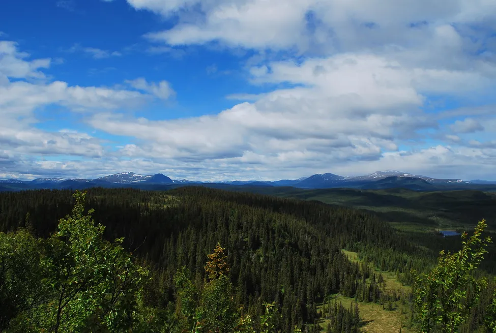 Att klättra upp på Kalvtjärnberget är lite bökigt (snårigt och dant), men ger givetvis fin utsikt. På bilden ses Södra Borgafjällen höja sig till vänster, och Norra Borgafjällen till höger. Juni 2018.