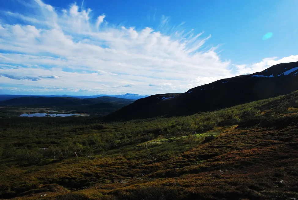Fjällsidan strax norr om Lill-Månkesvallen längs med leden. Det något toppiga fjället i fjärran heter Bastunäsklumpen. Juni 2016.