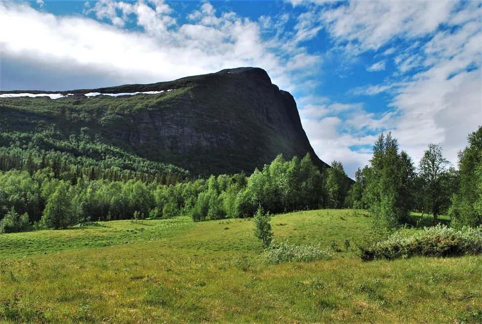 Ett ikoniskt fjäll som reser sig nästan 700 meter över Borgasjön, till stor del som en i princip lodrät vägg. Går att ta sig upp på via en brant ravin, där snön ofta ligger kvar länge vilket gör det klurigt att ta sig upp om man (som jag ofta gör) förlägger besöket till juni månad. Man kan då få nöja sig med att strosa vid foten av den mäktiga klippan, vilket inte är så dumt det heller. Bild från sydost, juni 2016.
