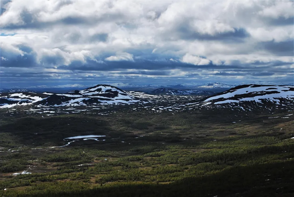 Utsikt över Slipsikåns dalgång uppifrån fjället återigen kring Gasketjahke. Himlen är nära. Juni 2015.