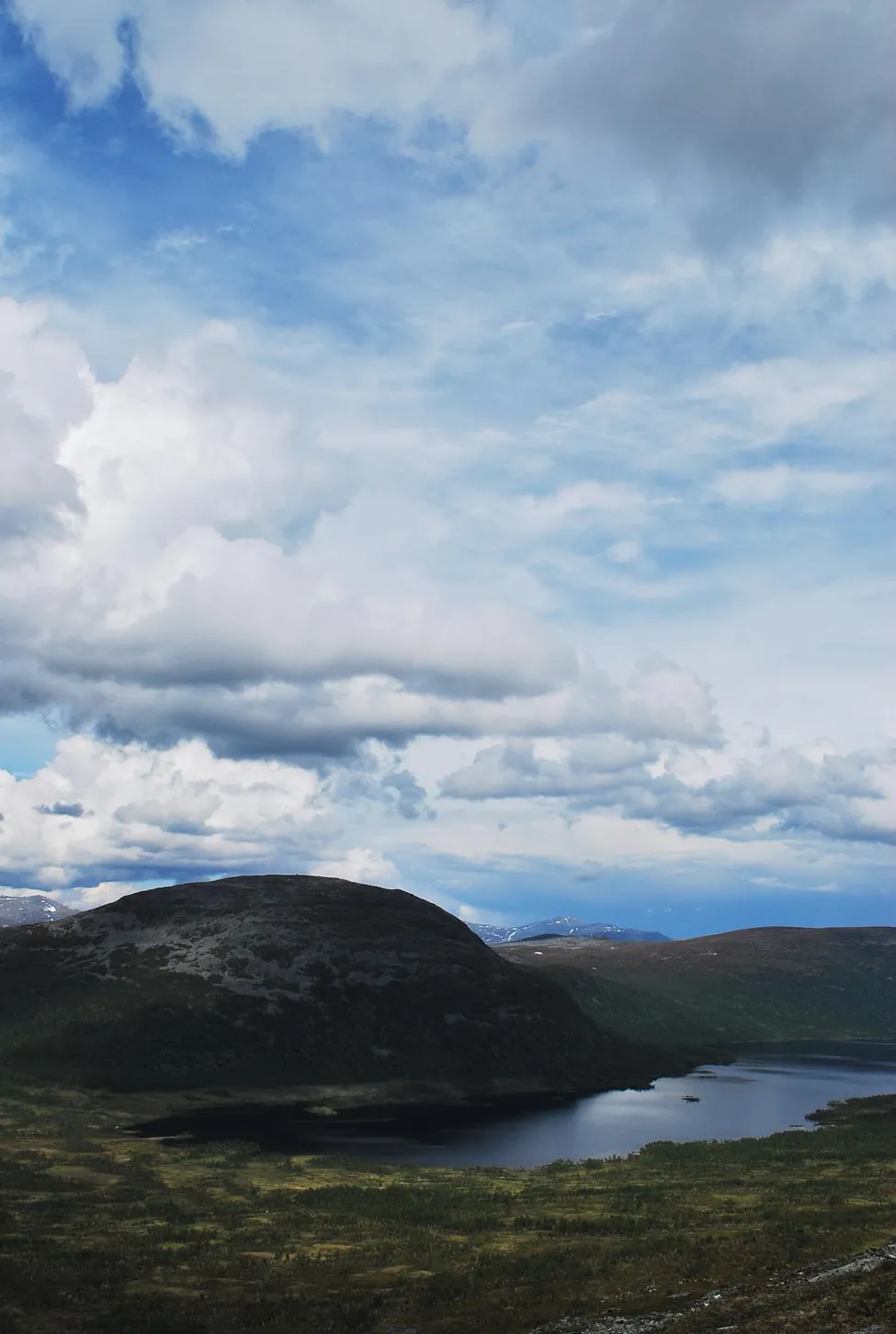Lievkiesoja och Saxaborga sedda ungefär rakt västerifrån, från där leden kommer upp på kalfjället. Juni 2016.