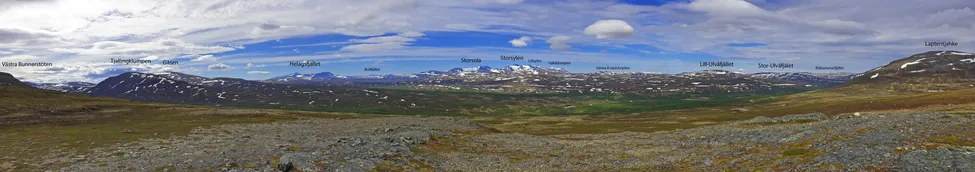Panorama från sluttningen söder om Västra Bunnerstöten, ovanför Tjallingdalen, som visar den fantastiska utsikten söderut i Jämtlands fjällvärld. OBS de inskrivna namnen på fjällen i bilden.