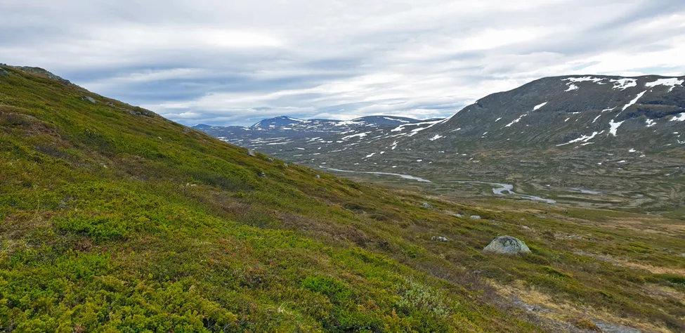 Vy österut i Tjallingdalen från södra sluttningen av Västra Bunnerstöten. Till höger syns Tjallingklumpen och i bakgrunden Kleevetje