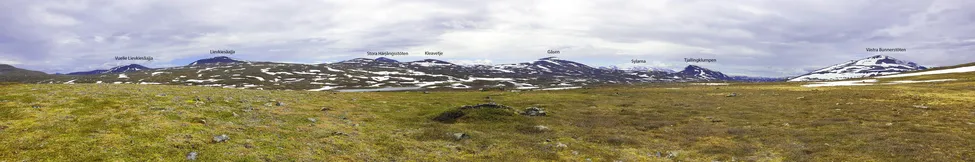 Panorama från sluttningen söder om Stäntja där utsikten söderut åter igen var milsvid. OBS de inskrivna namnen på fjällen i bilden.