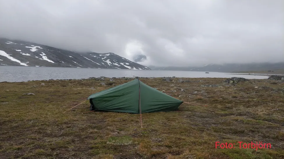 Stigningen var brutal. 5,6 km tog tre timmar. När jag kom till Bessvatnet östra del var det kväll och sikten blev snabbt sämre. Tog beslut att slå läger där och inte riskera att inte hinna fram till Russvatnet.