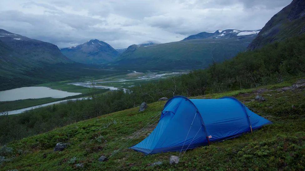 Tältplatsen ovanför Rapadalen, med Rovdjurstorget i bakgrunden