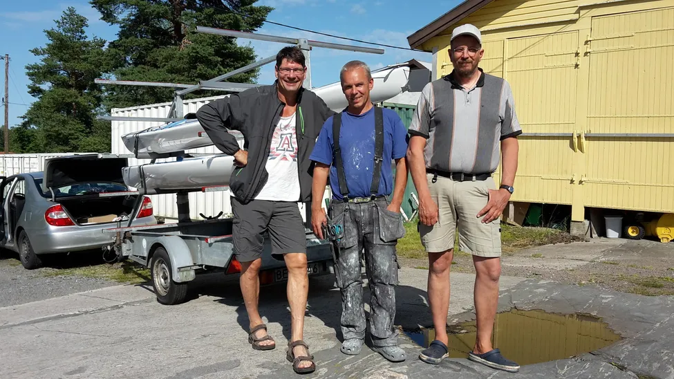 Kanotbyggare Kåre mellan två glada Nyköpingskanotister vid våra alldeles nya VKV Anita, som "mäster" byggt åt oss.