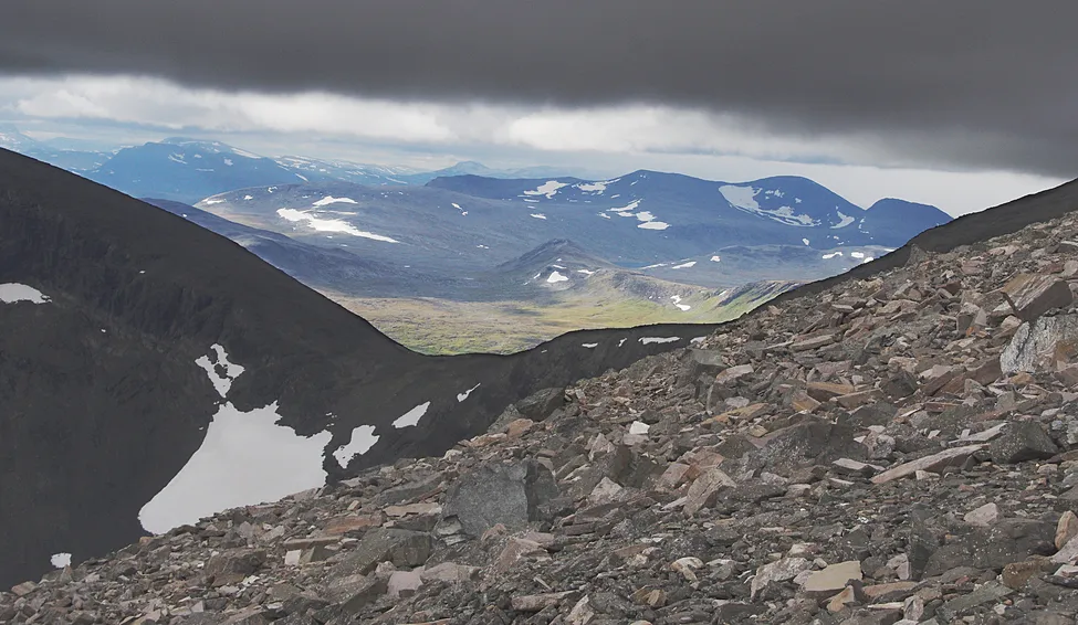På väg upp till Pårtetjåhkkå observatorium får man den här vyn mot sadelpunkten 1425, det vill säga öppningen mellan Ruopsokvárásj (mörka till vänster) och Bårddetjåhkkås sydvästkam (tunna mörka till höger). I fjärran bortanför sadelpunkten syns Låptåvágge i solbelysning. Det lilla toppiga berget i mitten är Mangitjårro och bakom till höger syns en minimal flik av Låptåvákkjávrre. Länk till stort format:
