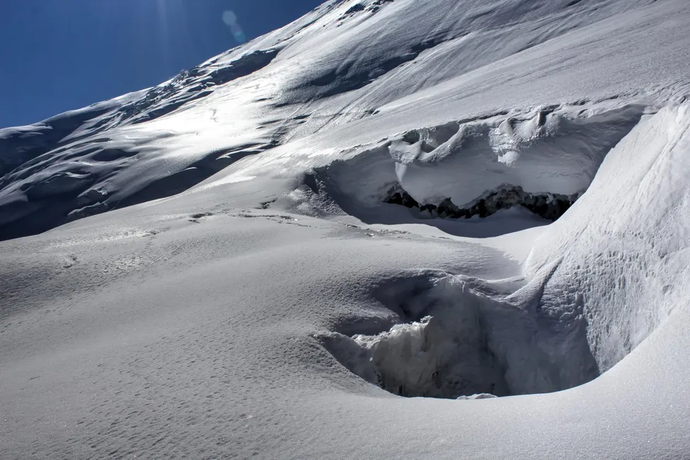 Stora glaciärsprickor mellan ABC och läger 2. En miljö att undvika efter en sen eftermiddag.