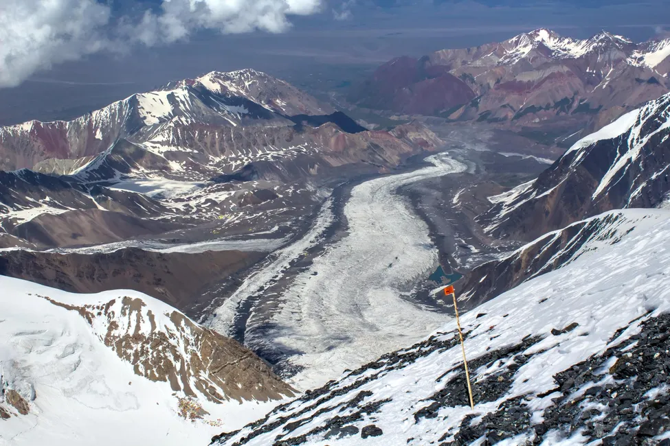 Utblick från bergsryggen. T.v. ser man läger 2. I mitten kan man se de gula tälten vid ABC och de gröna ängarna vid basl