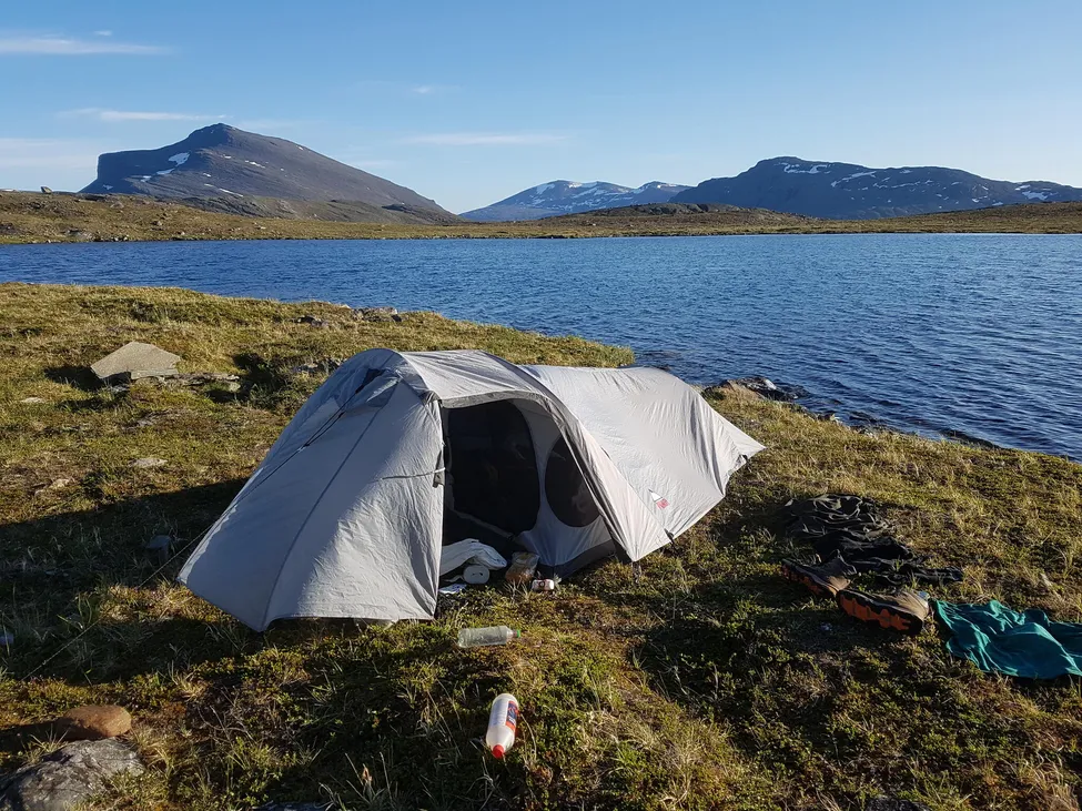 Året var 2018 då jag vandrade mellan Vakkotavare och Nikkaloukta, men jag tog en avstickare mot Durlingsled och toppen, men möttes av för mycket is mot skrået till Kaffedalen, så det var bara att vända och sedan tog jag genvägen till Kebnekaise fjällstation. Upp mot toppen på genvägen fanns en stor damm. Jag provade att bada med det var alldeles för långgrunt och halt. Slog i knäna när jag skulle simma. Men vackert var det och lugnt, varmt och skönt. Sov gott hela natten med en massa vågskvalp i bakgrunden.