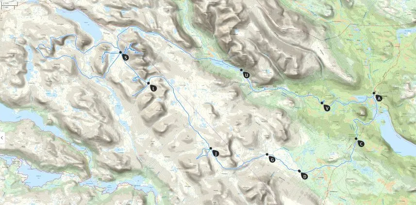 Rutten för turen. Svarta prickar är tältplatserna.