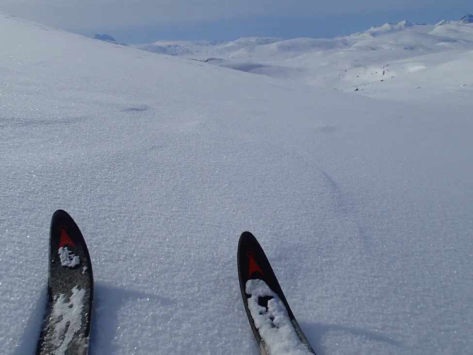Nerfart i fin nysnö med gnistrande kristaller. Dag 8.
