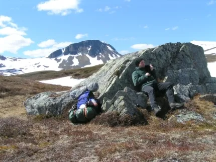 Tar igen mig i lä bakom stenen, sätter upp basläger i närheten för dagsturer till ekorren(bakgrunden) och över till Sylarna. Tyckte det var kul med stenformationen i relation till Ekorren.(taget med stativ)