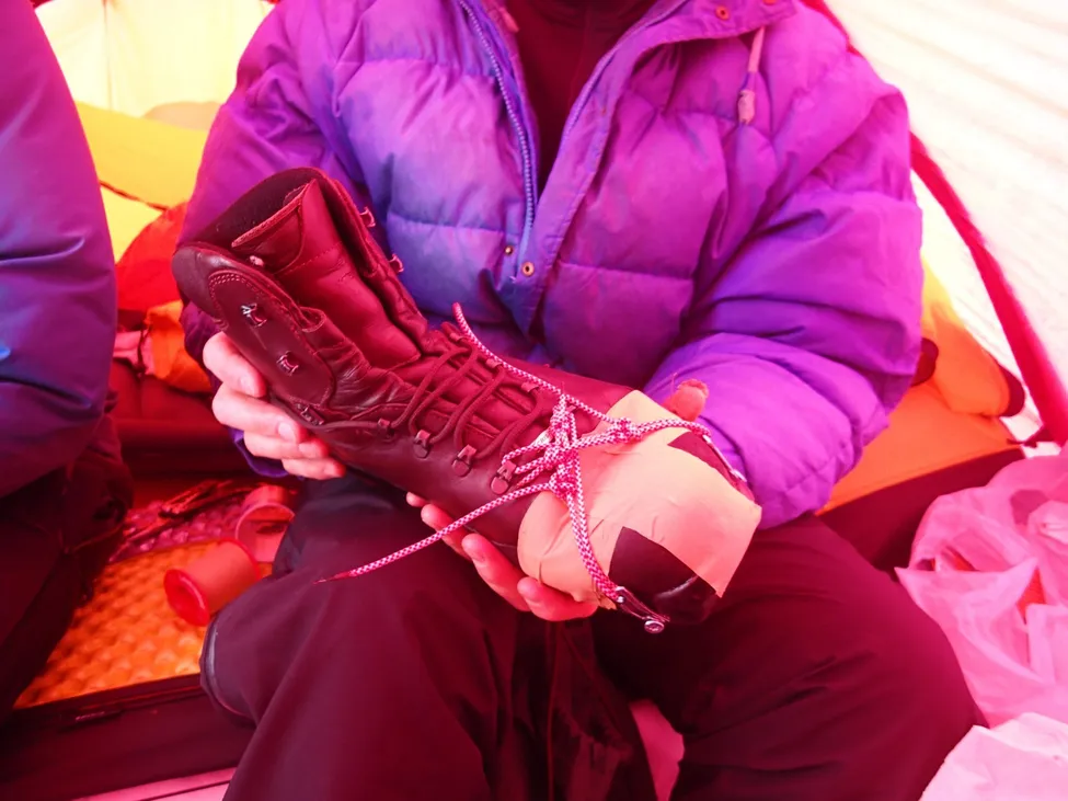 Anders hade med sig massor av bra reparationssaker. Så vi lyckades stabilisera pjäxan med hjälp av lim, tejp, skruvar oc