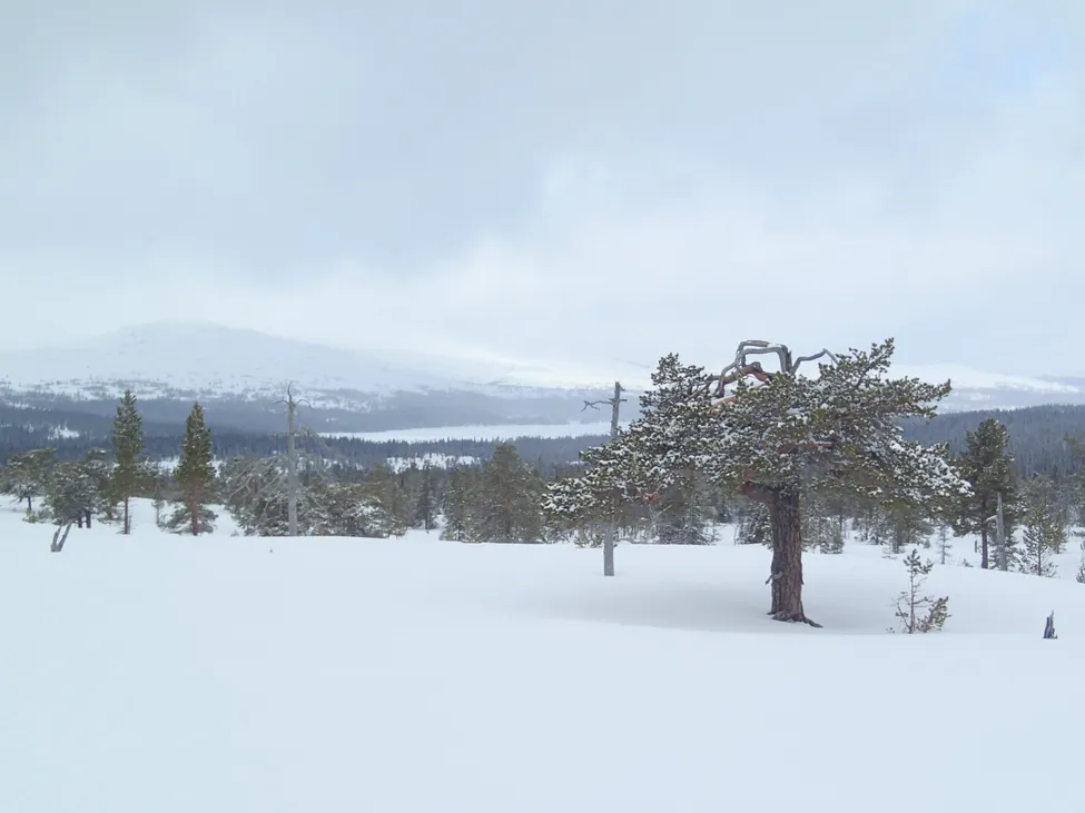 Dag 7. Bild 2. På väg ner i skogen stötte vi på denna sparbanks-tall. Sjön Holdern syns där nere.