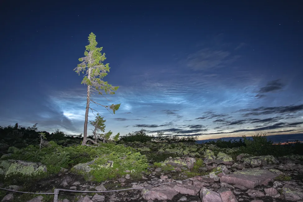 Old Tjikko och NOC - nattlysande moln i månsken - 2021-08-03