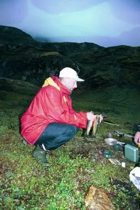 Midnatsfiskeri på højfjeldet ved Lofoten. To fine ørreder til smøret på panden på primusen ...