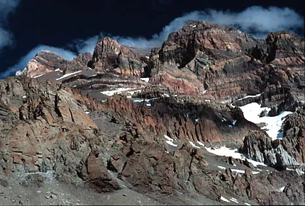 Aconcaguas nordtopp, centraltopp och sydtopp (från vänster). Taget från Camp Canada 4900möh. Denna sida av berget är nästan snöfri pga blåsten. I coloiren till höger går en fin alternativ led till normalleden, Cara Oeste