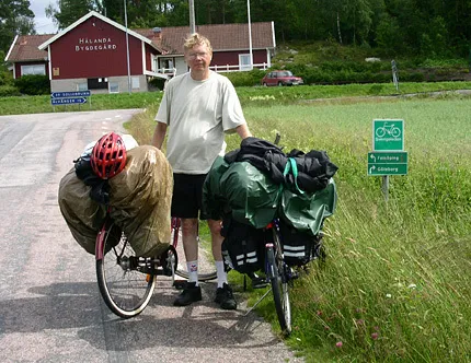 20 dagar och ca 180 mil avverkades. Rundade Vänern. Cyklade genom Skåne, Blekinge, Småland, Västergötland, Närke, Värmland, Dalsland, Bohuslän, Halland och tillbaka till Skåne. 9 mil om dagen i snitt. Det regnade varje dag. Bodde i tält och lagade egen mat på spritköket. Foto: Katsue Grape.