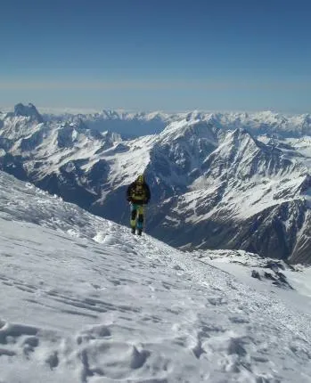 I sadeln 5400m, hur gick det då? Varför finns det ingen bild från toppen? Mitt i traversen uppför sista branten tappar min klätterkamrat balansen och faller handlöst nerför hela sluttningen ca 3-400m. Han klarar sig turligt nog med en stukad fot, ett skadat öga och en rejäl dos huvudvärk. Inget alternativ för mig att fortsätta vidare själv. En dag återvänder jag.. :D o då inknuten sista biten!
