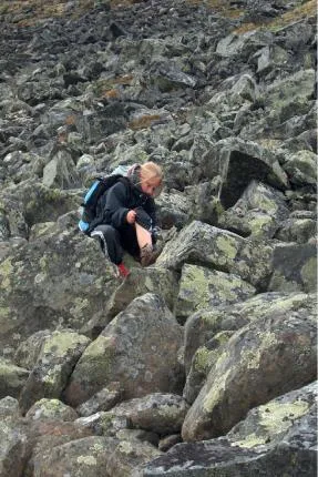 Anna holder en lille pause i Kaskasavagges blokmark.