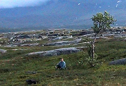 Jag, tillsammans med min yngsta bror (som håller i kameran) och vår pappa, besöker korspunkten vid X7600000 Y1600000. En knotig björk hade nästan varit före oss på platsen... (-: