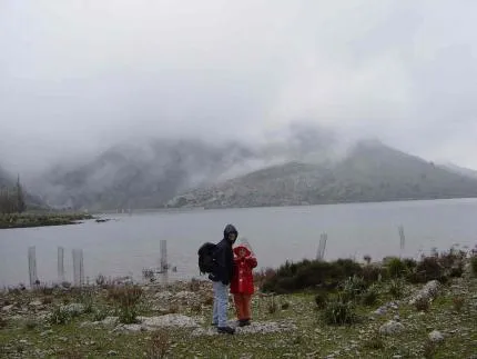 María José och Elena trotsar regnet vid en över bräddarna fylld Cúber.