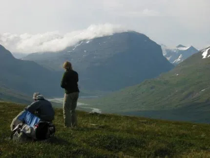 Äntligen en dag med solsken! Jonas och Maria blickar ned i Rapadalen en morgon när Sarek visar sig från den ljusa sidan och invaggar oss i förhoppningen om en relativt torr dag.