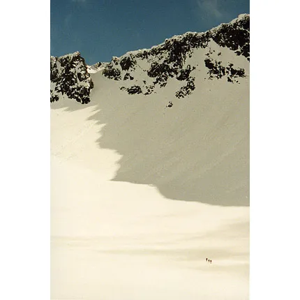 Vi är på väg uppför rännan i övre vänstra hörnet på bilden.