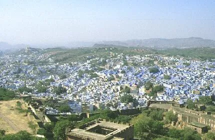 Vy över Jodhpur även kallad "den blå staden". Fotograferat uppifrån murarna till Meherangarh fort.